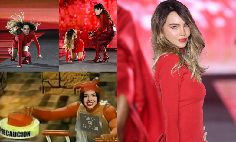 El comediante colocó una imagen dividida en tres escenas, la primera de Belinda cayendo al suelo, la segunda cuando se acerca a ayudarla Anitta, pero la brasileña fue editada y en su lugar colocaron el rostro de Cazzu, y en el recuadro más grande, donde aparece “El Diablito” presionando el botón que “habría provocado” la caída de la española, pero con la cara de Ángela Aguilar.